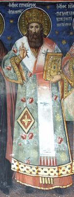 | Свт. Григорий Палама. Фреска ок. 1371 г. Роспись церкви святых Бессребреников Афонского Ватопедского монастыря. |