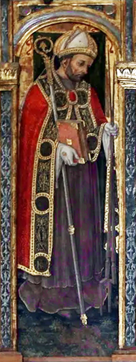 Подпись к иллюстрации: Сщмч. Васс Никеанский. Западная икона (левая часть "Триптиха со святым Бассо", автор Витторио Кривелли или Карло Кривелли, ок. 1435-1440 гг.). Католический храм Санта-Мария-ин-Кастелло в Купра-Мариттима, ИталияЭта иллюстрация использована на страницах: