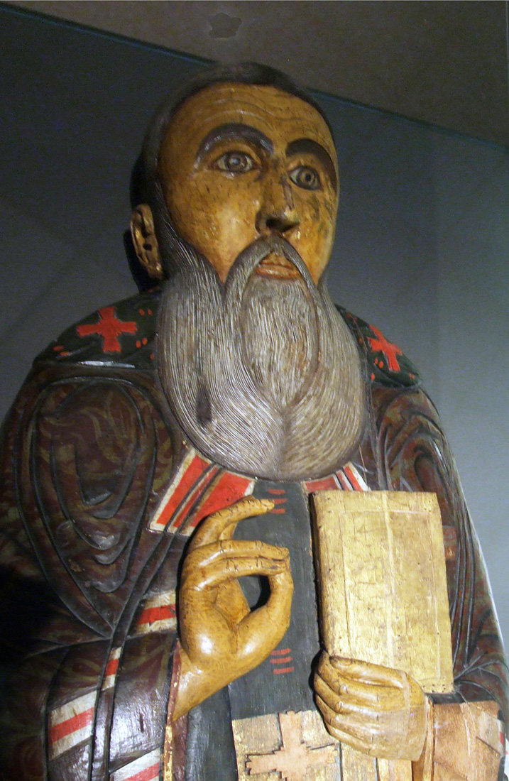 Подпись к иллюстрации: Свт. Иоанн Новгородский. Рельефная фигура с крышки раки (1559 г., Новгород; темперная роспись XVII в) из Софийского собора Великого Новгорода. Государственный Русский музейЭта иллюстрация использована на страницах: