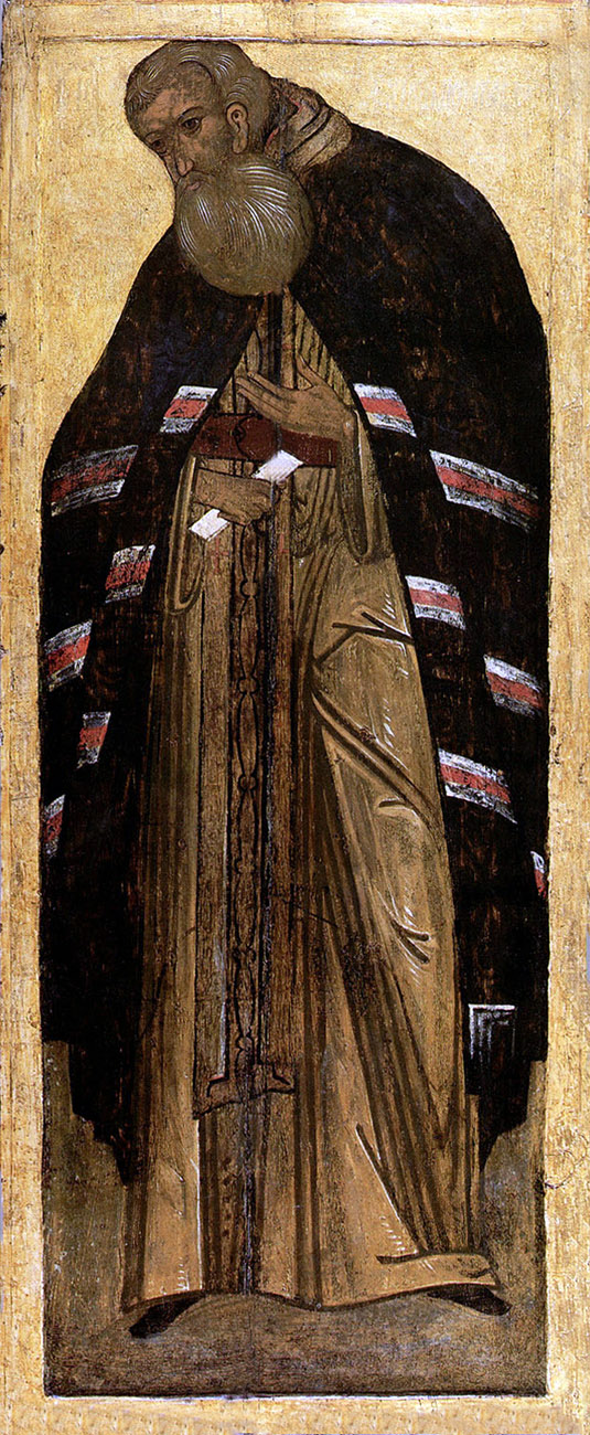 Подпись к иллюстрации: Свт. Иоанн Новгородский. Икона (русский Север, 2-я пол. XVI в. 107×43) из иконостаса Покровской церкви Кижского погоста. Музей изобразительных искусств Республики Карелия, ПетрозаводскЭта иллюстрация использована на страницах: