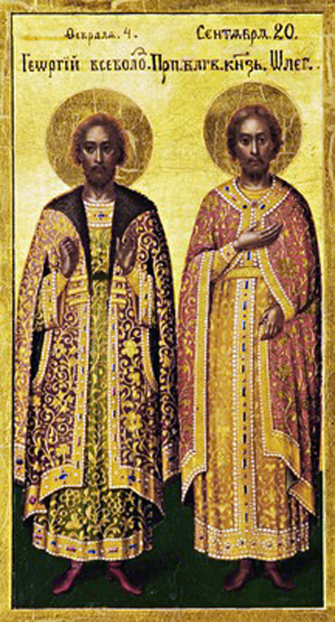Подпись к иллюстрации: Блгв. кн. Владимирский Георгий Всеволодович и прп. блгв. кн. Олег Брянский (клеймо иконы "Все свв. Российские вел. князья, княгини и княжны рода царского", 1860-е гг.). Князь-Владимирский собор, Санкт-ПетербургЭта иллюстрация использована на страницах: