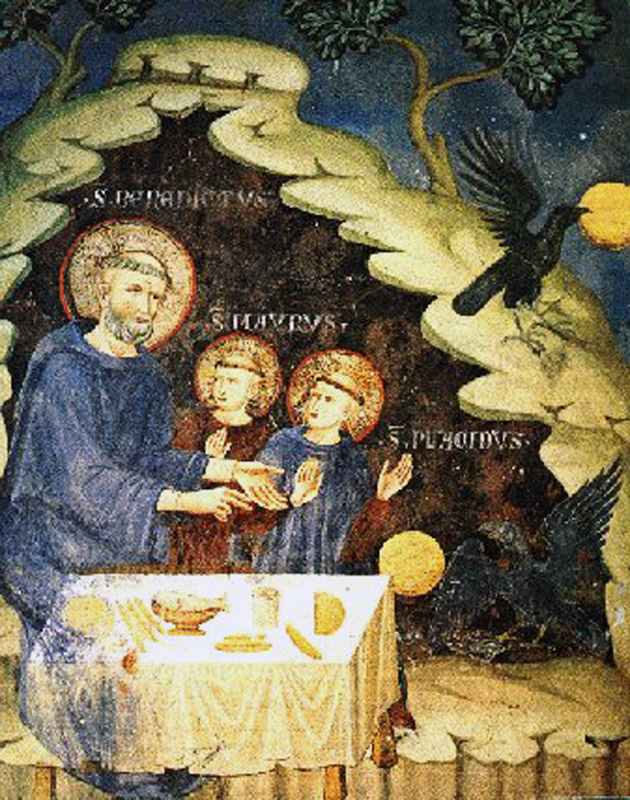 Подпись к иллюстрации: Прп. Венедикт Нурсийский со своими учениками Мавром и Плакидом Субиакскими. Фреска в Святой пещере Субиакского монастыряЭта иллюстрация использована на страницах: