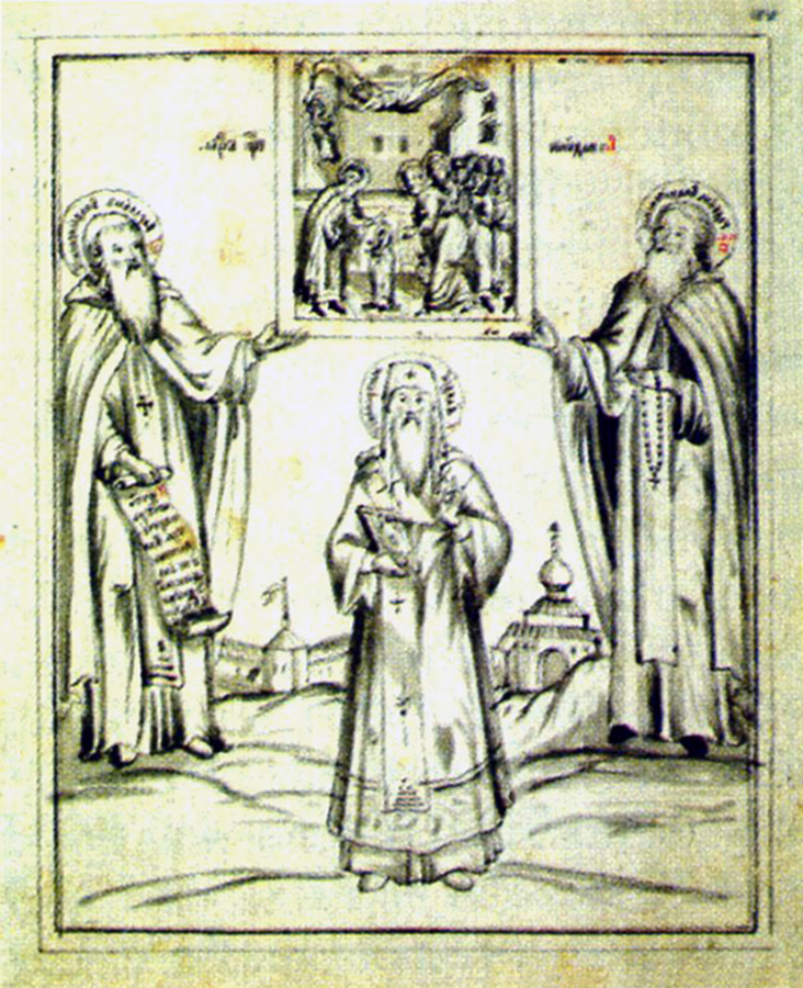 Подпись к иллюстрации: Свт. Алексий, митр. Киевский, прпп. Варлаам и Гедеон Серпуховские с иконой Введения. Рисунок пером (Москва, XIX в.). Серпуховский историко-художественный музейЭта иллюстрация использована на страницах: