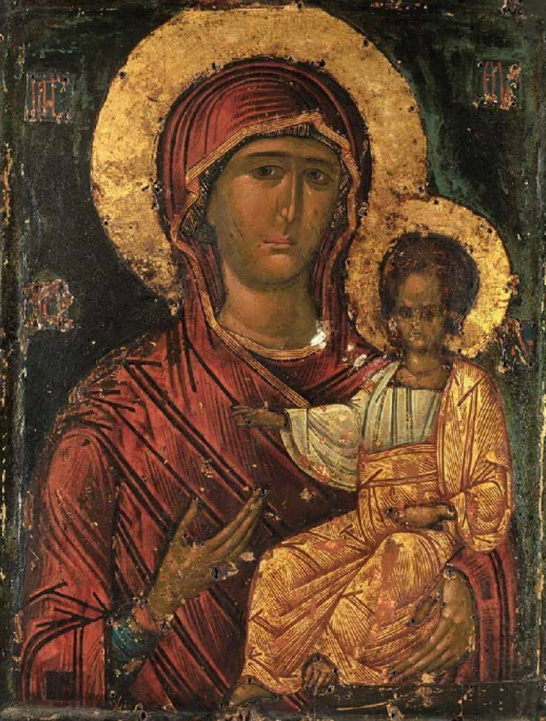 Подпись к иллюстрации: Икона Богородицы "Палеологи́на", "Всецарица", "Не сгоревшая в огне". XIV в. Монастырь Григориат, АфонЭта иллюстрация пока нигде не использована
