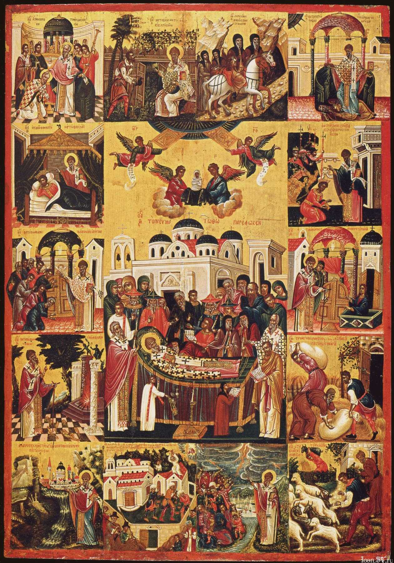 Подпись к иллюстрации: Икона "Успение свт. Спиридона со сценами жития" Иконописец Эммануил Тцанфурнарис (Манос). Критская школа. (60,5 × 42,8 см.), 1595 г. Собрание Музея икон. Венеция. ИталияЭта иллюстрация использована на страницах: