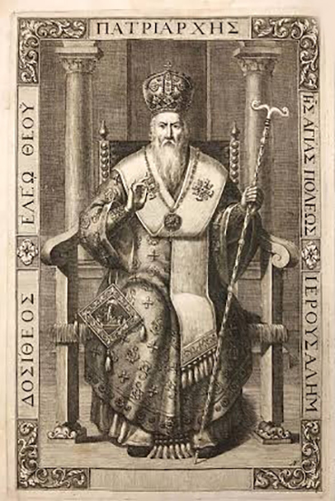 Подпись к иллюстрации: Досифей II Нотара, патриарх Иерусалимский. Гравюра из сборника «Томос радости» (Τόμος χαρᾶς). 1705 г.Эта иллюстрация использована на страницах: